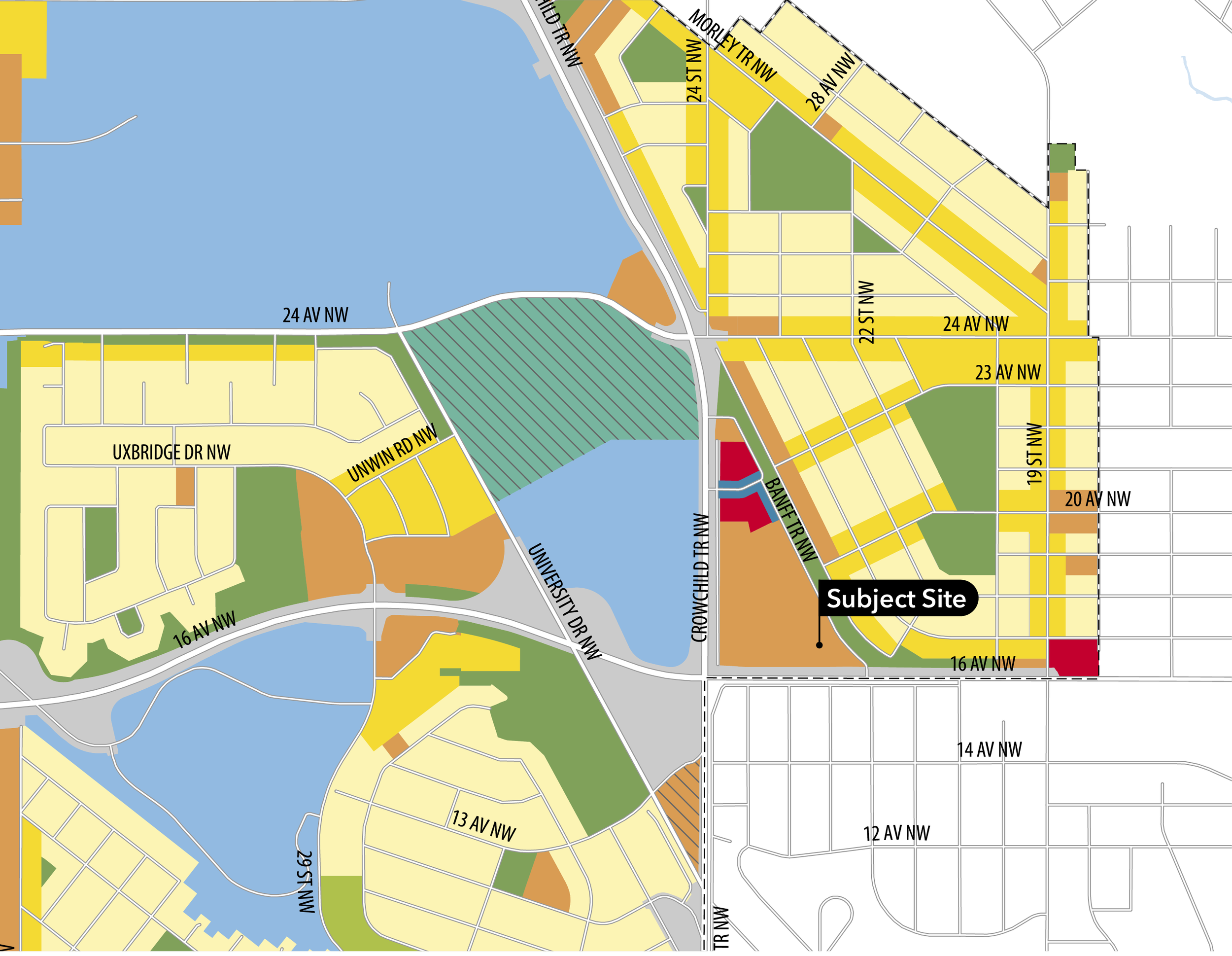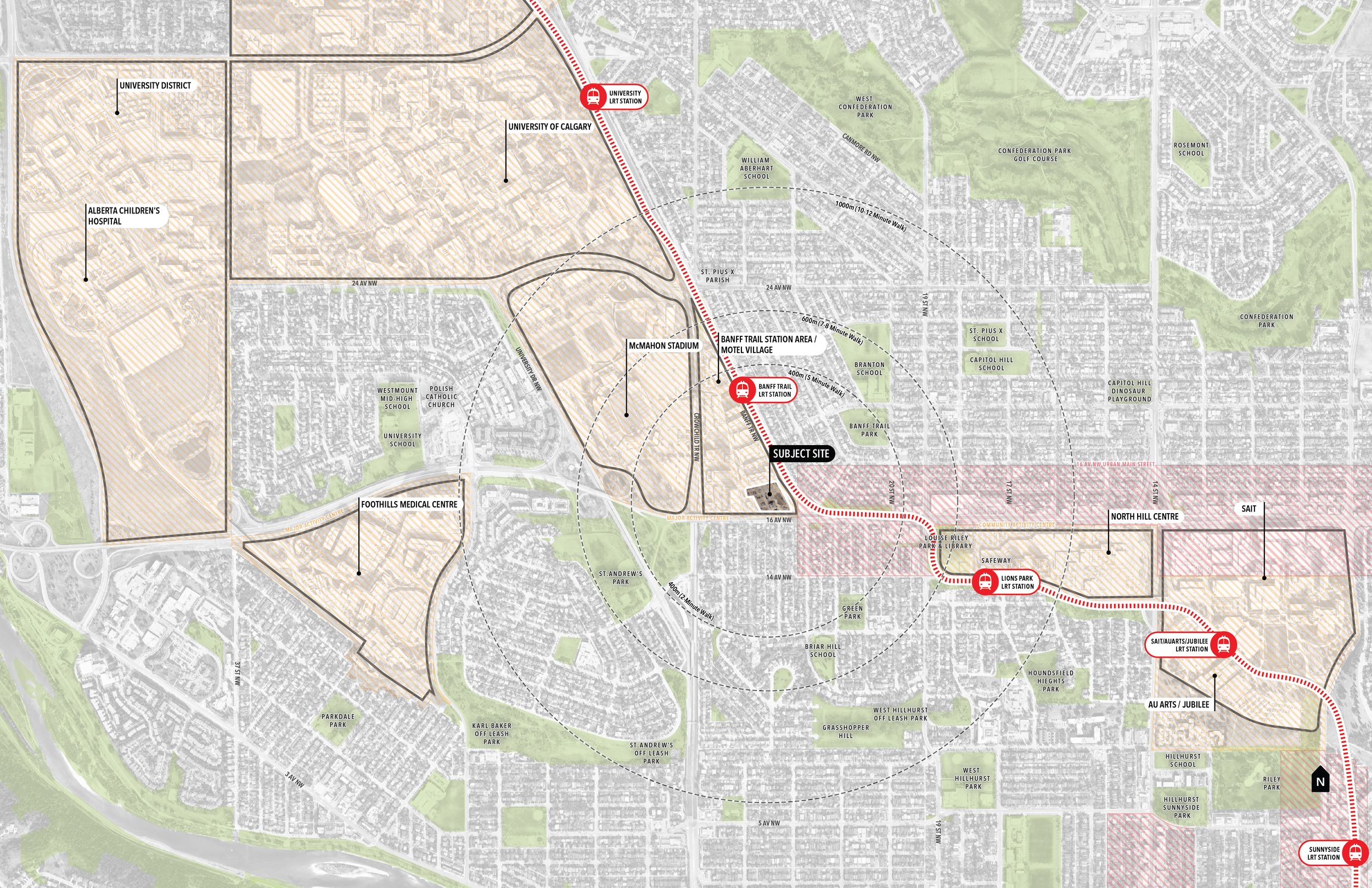 The subject site presents a significant opportunity for strategic growth and redevelopment, supported by the contemporary local area policy of the South Shaganappi Communities Local Area Plan (SSCLAP, 2025), easy access to frequent transit and its proximity to parks, schools, local shops, community services and other everyday amenities that contribute to a complete neighbourhood.