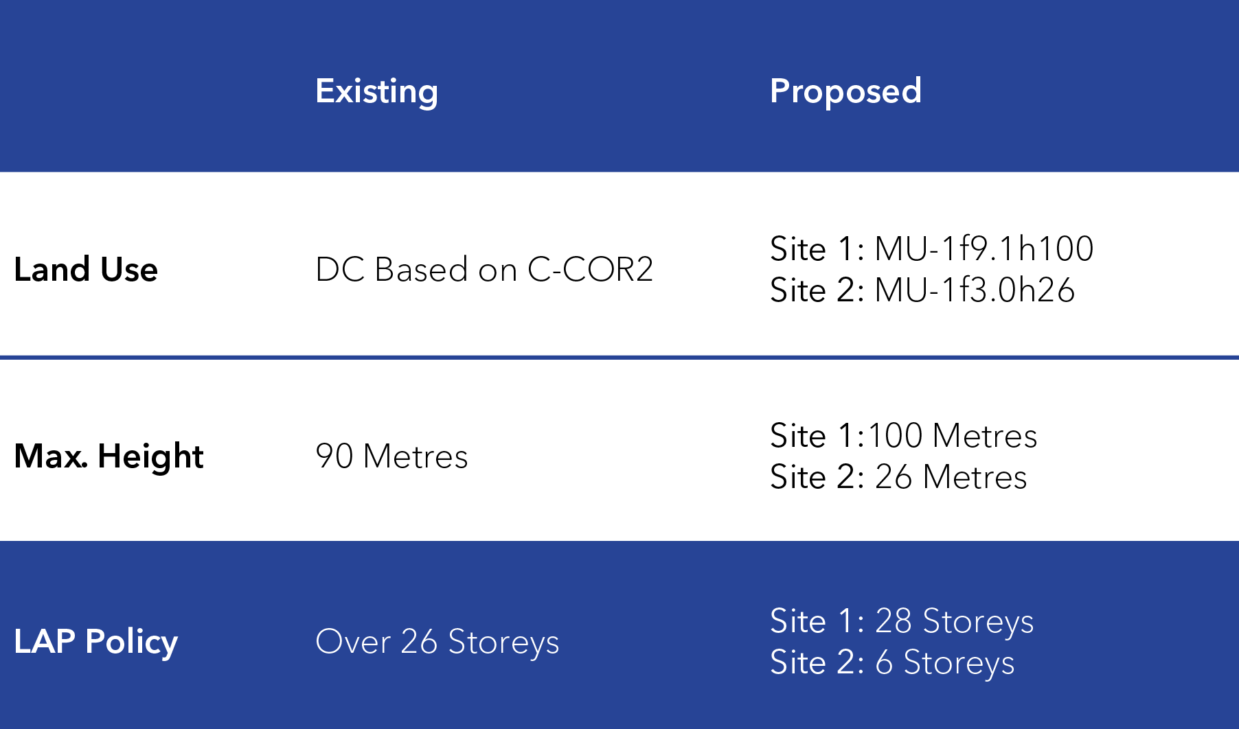 The proposed land use change would transition the subject lands from the existing Direct Control (DC) District (DC136D2015) to two separate Mixed Use – General (MU-1) Districts, with site-specific custom building height and Floor Area Ratio (FAR) modifiers for Site 1 (DAL Holdings) and Site 2 (WestCliff Developments). These custom modifiers limit maximum FAR to 9.1 (Site 1: DAL Holdings) and 3.0 (Site 2: WestCliff Developments), and allow for building heights of up to 100 metres (Site 1: DAL Holdings) and 26 metres (Site 2: WestCliff Developments).